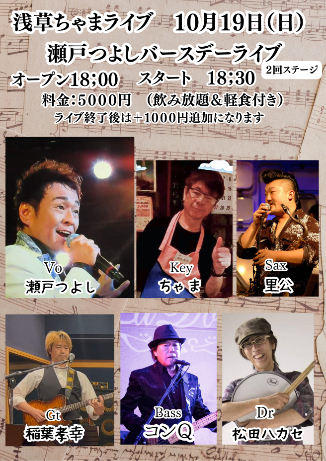 SCHEDULE イベント出演情報 TV・イベント・ライブ バースデー浅草ちゃまライブ 日時:10月19日(日) OPEN:18:00 スタート18:30 場所:浅草ちゃま 東京都台東区西浅草3丁目14-6 料金:5000円(飲み放題&軽食付き) ライブ後+1000円 ご予約はこちら 日時: 開場 開演 ご予約はこちら 日時: 開場: 開演: 場所: 料金: ご予約はこちら ご予約はこちら 日時: 開場: 開演: 場所: 料金: ご予約はこちら 日時: 開場: 開演: 場所: 料金: ご予約はこちら 日時: 開場: 開演: 料金: